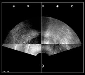 - Ajustez la profondeur de la prostate, c’est-à-dire que la prostate ne doit pas dépasser plus de la moitié de l’image ultrasons.