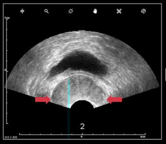 - Les lobes dépassent l'image échographique → Déformation de la glande due à une pression excessive sur la prostate.